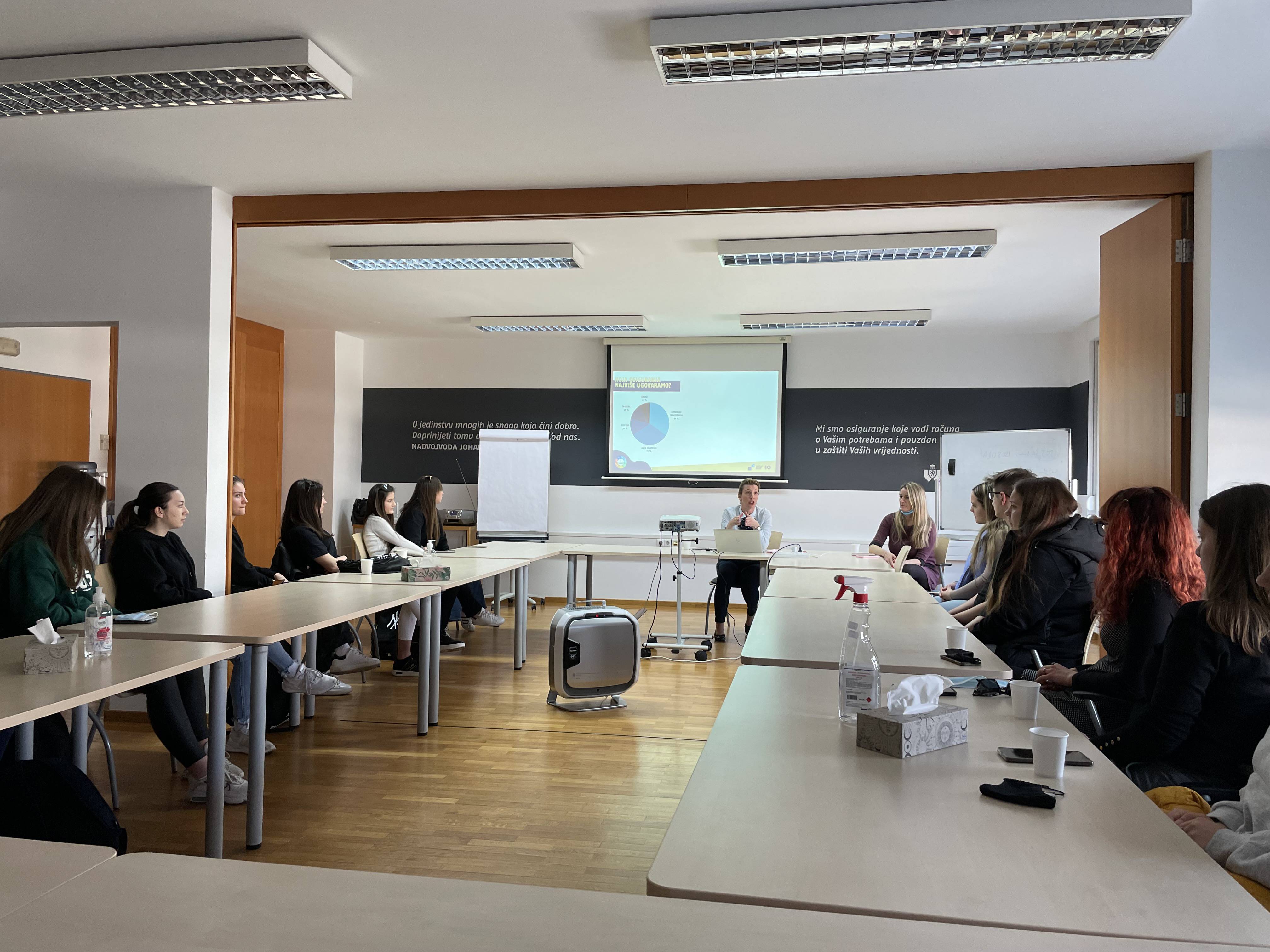 POSJET UČENIKA ZAVRŠNIH RAZREDA DRUGE EKONOMSKE ŠKOLE GRAWE OSIGURANJU Dana 23. ožujka 2022. učenici četvrtih razreda Druge ekonomske škole u sklopu terenske nastave iz predmeta Bankarstvo i osiguranje posjetili su Grawe osiguravajuću kuću u pratnji profesorica Natalije Volarić i Ane Lasić. Povodom Svjetskog tjedna novca koji se obilježava 21. 3. - 25. 3. 2022. za učenike je organizirano predavanje na temu „Financijska pismenost mladih“, a koje je održala gospođa Milena Žganjer, zastupnica u osiguranju. Naglasak je bio na financijskoj pismenosti i poznavanju osigurateljnih proizvoda i industrije. Nakon predavanja u trajanju od 60 minuta učenici su imali priliku postavljati pitanja predavačima o navedenoj temi. Učenici su bili vrlo zainteresirani, pažljivo su pratili izlaganje te puni dojmova završili svoj posjet. Ovom prilikom zahvaljujemo djelatnicima Grawe osiguranja na organizaciji i toplom prijemu.