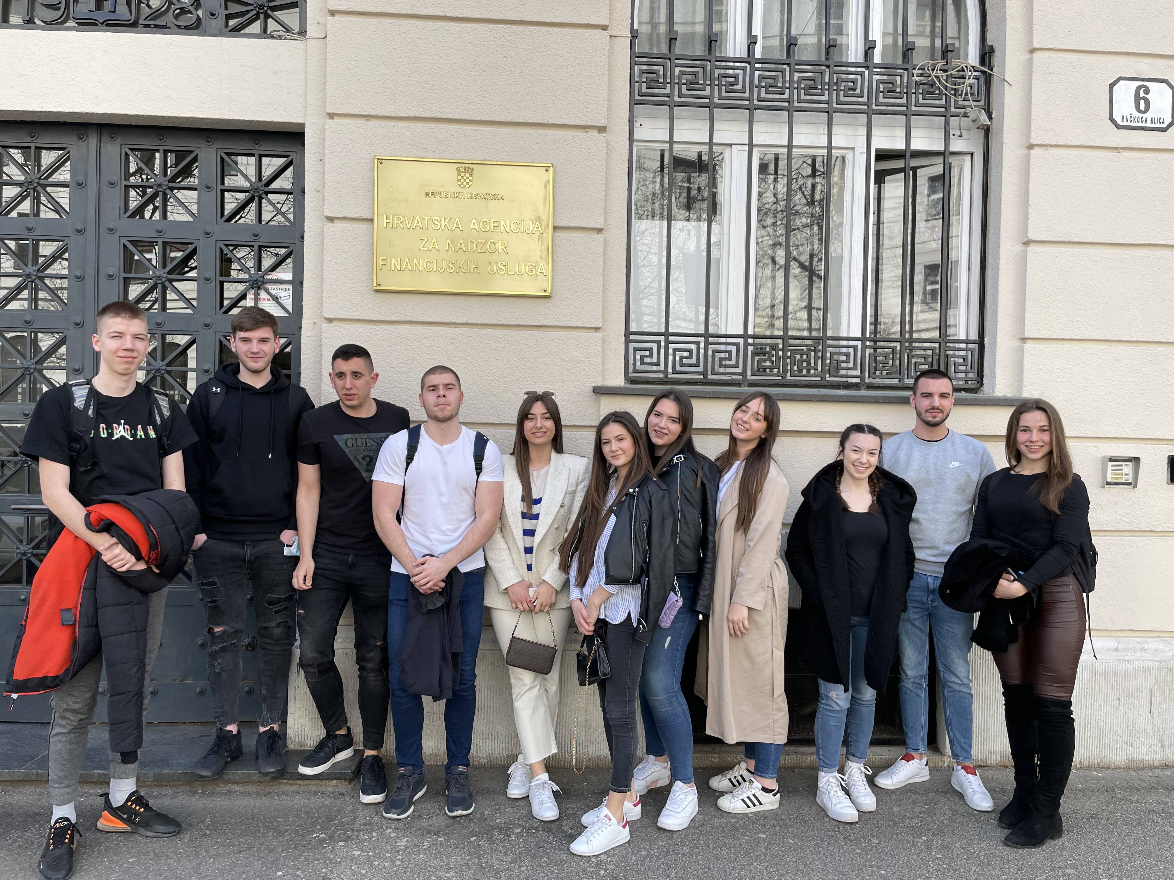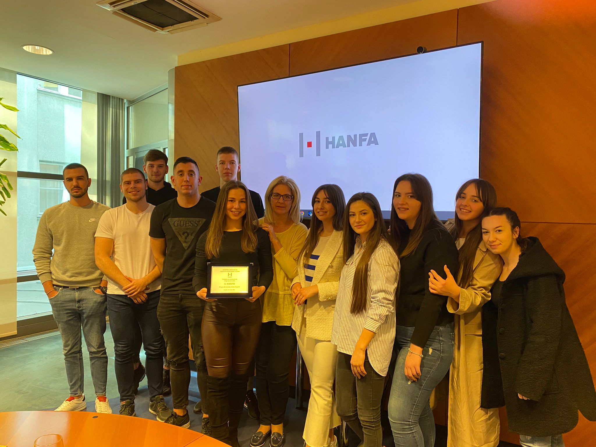 DODJELA NAGRADE ZA OSVOJENO TREĆE MJESTO NA NATJEČAJU HANFE Učenici 4. e razreda sudjelovali su na natječaju koji je objavila HANFA pod nazivom „Osiguraj se mudro“ u sklopu kojeg su izradili edukativni videouradak prema smjernicama koje su navedene u natječaju. Od 22 škole iz cijele Hrvatske koje su prijavile svoje radove učenici naše škole osvojili su treće mjesto te su pozvani na dodjelu nagrada u prostorijama HANFE. Dana 8. travnja 2022. učenici su posjetili HANFU u pratnji prof. Natalije Volarić, mentorice na ovom natječaju, gdje im je svečano uručena plaketa za osvojeno treće mjesto i prigodni darovi. Za učenike je nakon dodjele nagrade održana edukacija na temu mirovinske štednje koju su učenici sa zanimanjem pratili. Nakon predavanja u trajanju od 45 minuta učenici su imali priliku postavljati pitanja predavačima o navedenoj temi, kao i na online kvizu provjeriti naučeno. Za kraj su se učenici fotografirali s mentoricom i plaketom u prostorijama HANFE te puni dojmova završili svoj posjet. Ovom prilikom zahvaljujemo djelatnicima HANFE na vremenu i trudu te toplom prijemu.