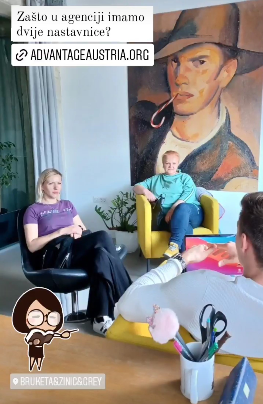 U sklopu projekta „Nastavnici u poduzeća – praksa za nastavnike“, kojeg provodi ADVANTAGE AUSTRIA, nastavnica ekonomskih predmeta Ivana Brnada bila je na stručnoj praksi u Agenciji Bruketa&Žinić&Grey 19. i 20. travnja 2022. Nezaboravno iskustvo kojeg vrijedi ponoviti te nesebično dijeljenje znanja zaposlenika agencije obogatilo je njezino znanje iz marketinga izvrsnim primjerima dobre prakse.